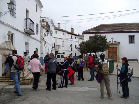 Cuarenta minutos separan andando estos dos municipios ,la vereda por las calles del pueblo es muy agradable ,llegamos a la plaza de la Iglesia y de nuevo el agua nos saluda, la fuente de los 5 caños nos ofrece su manjar que tomamos, algunos senderistas llenaron sus provisiones de agua para el camino que nos quedaba.