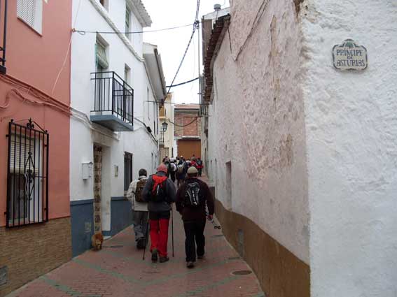 Retoma el grupo la ruta por la calle Príncipe de Asturias hasta salir del pueblo en dirección al tramo del sendero GR7 ya conocido por los senderistas que està como a kilometro y medio. La cañada de “ la corbata” es ahora nuestro sendero hasta salir de nuevo a la carretera. Las viejas tapias de este tramo no han podido resistir las últimas lluvias y algunos corrimientos de tierra nos obligan a desviarnos en algún tramo de la misma sin el mayor peligro.
