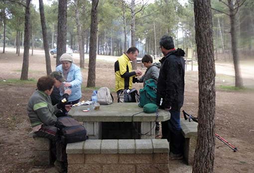 Un pequeño descanso en este sitio, nos emplazo de nuevo al sendero, desandando nuestros pasos nos dirigimos hacia una senda que en bajada y escondida entre retamas, aulagas, plantas aromáticas y encinas de pequeño porte, nos dejo en una pequeña área recreativa, donde nos reagrupamos.