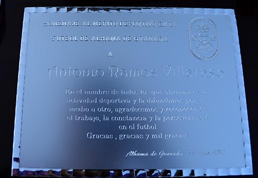El acto se celebró en el descanso del partido y con el equipo más pequeño de la UD Alhameña, el equipo bebé, arropando al presidente en el que pudo ser su último acto como tal. Francisco Palma, como capitán del equipo bebé y como representante del futuro del club, fue el encargado de entregar una placa conmemorativa a un emocionado Antonio que tuvo palabras de agradecimiento para los presentes y su junta directiva, a la que seguirá apoyando pero desde la segunda línea.