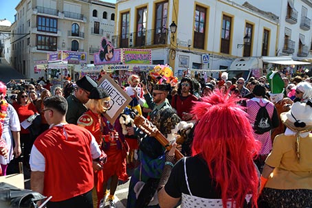 En la jornada del domingo daba comienzo el carnaval de Alhama, uno de las fiestas rurales más típicas de la provincia y una de los pocos carnavales que tiene el reconocimiento de Fiesta de Interés Turístico de Andalucía. En torno al mediodía las comparsas se fueron congregando en la plaza Duque de Mandas para desde allí iniciar un pasacalle. Los primeros en llegar fueron los 'Gorrioncillos de placeta' con una persona enjaulada y una treintena de jovencísimos integrantes. Después lo harían los 'Juerga Civil' del IES de Alhama, en el que se integran la nieta del que fuera uno de los grandes carnavaleros alhameños, Antonio López, 'El Viñero', al que le ha dedicado una 'coplilla' y la alcaldesa de Zafarraya, Rosana Molina. A ellos se sumarían los más veteranos de la veterana comparsa del Pitorreo y los muy coloristas 'Pa'gustos colores' entre cuyos integrantes se encuentra el concejal de Fiestas, Álvaro Molina'. Todos juntos iniciarían un recorrido que les conducirían hasta la histórica plaza de los Presos, Caño Wamba y calle Llana para regresar al paseo del Cisne donde numeroso público esperaba el tradicional pregón del carnaval.