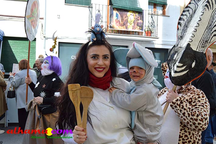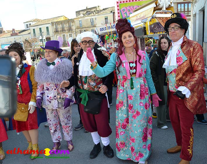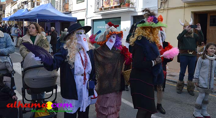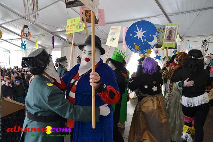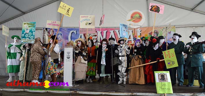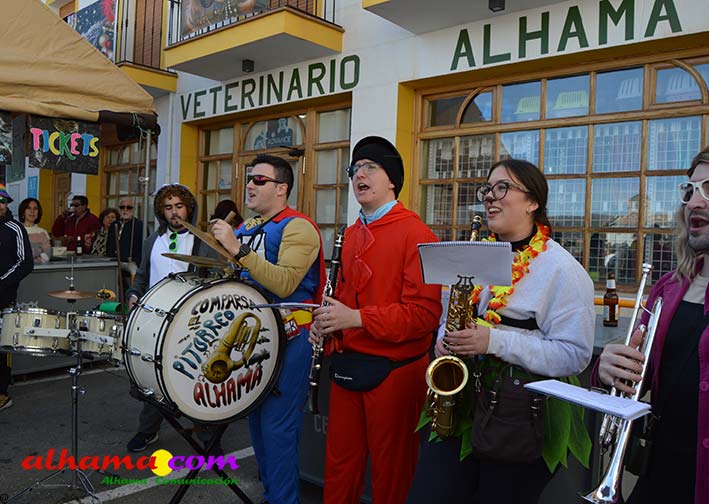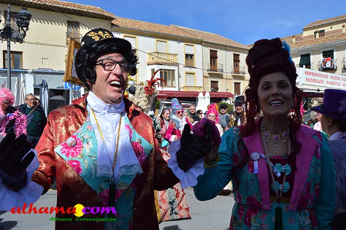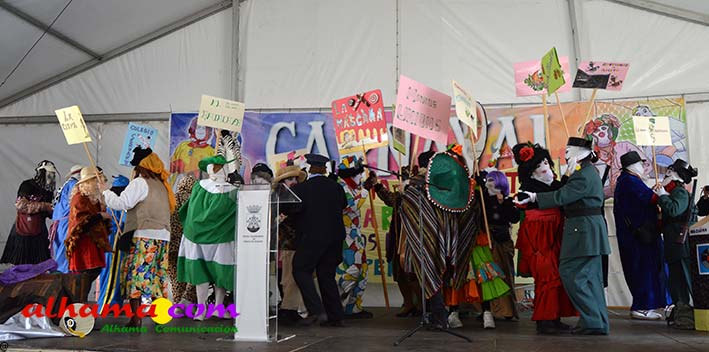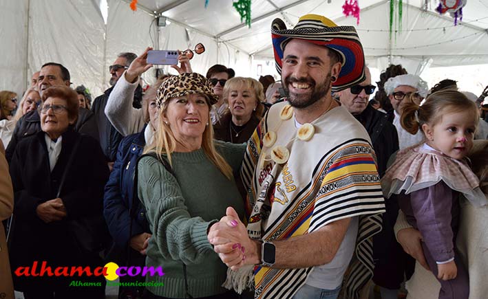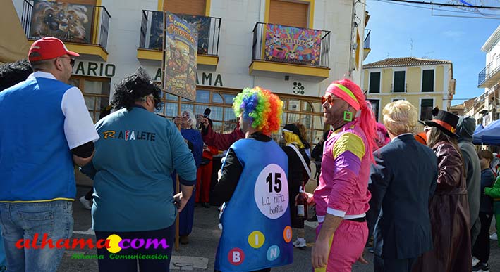 Por supuesto, también del Ayuntamiento que ha mantenido la programación habitual que se iniciaba en la mañana del domingo con un pasacalles carnavalero con las comparsas locales que transcurría por las principales calles de Alhama, al que siguió el pregón del Carnaval 2026 en la carpa municipal montada en el Paseo del Cisne qu en esta ocasión ha estado a cargo del Centro Permanente de Educación Alhucema que realizaron un completo recorrido por las principales agrupaciones a lo largo de los 46 años de carnavales democráticos en Alhama. Pregón que recibió las felicitaciones de la teniente de alcalde, Matilde Molina, así como de otros asistentes que valoraron la originalidad puesto que con una supuesta máquina de discos se hizo posible viajar en el tiempo al escuchar pequeños fragmentos de composiciones antiguas. Tras el mismo el carnaval se apoderó de la calle y tanto vecinos de Alhama como visitantes de los sitios más dispares disfrutaron de la gracia y picardía de las coplillas carnavaleras principalmente sobre temas locales y de las típicas máscaras jameñas y mascarones con la cara tapada.