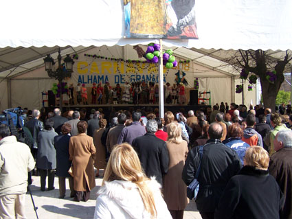A las una de la tarde, reporteros, murgas, comparsas, máscaras, alhameños y alhameñas y visitantes se reunían en el Paseo del Cisne y sus alrededores para escuchar el pregón de la mano de Juana Olmos Castillo.