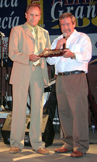 06/08/2005.- El alcalde de Alhama, Francisco Escobedo, entrega una placa de reconocimiento al qie fuera creador del Festival de la Canción, Andrés Gracía Maldonado, hace cuarenta años, en aquel 1966. Igualmente a Carmen Abenza en nombre de los participantes de este año.