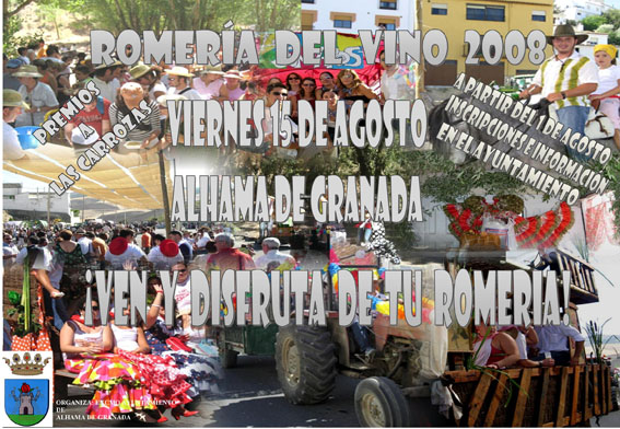 Ya se respira ambiente romero. En la víspera de la fiesta del 15 de agosto, Alhama se prepara para su evento más multitudinario junto con el carnaval. Alrededor de 30 carrozas, además de caballistas y otros participantes, darán color a la Romería del Vino, que mantiene la tradicional olla jameña, gazpacho y vino andaluz, como degustaciones ofrecidas por el Ayuntamiento.