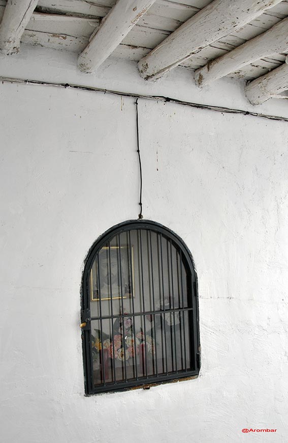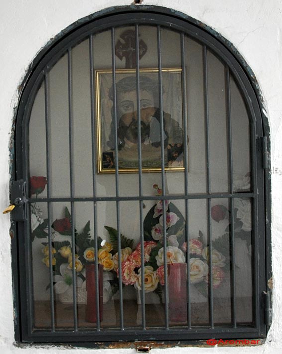 En su interior un cuadro con una estampa de con la cara de Jesucristo, y sobre esta estampa unas cortinillas hechas de encaje. Abajo, sobre el alféizar de este vano, jarroncitos y botes de cristal con flores de plástico. A la derecha e izquierda de esta imagen otras dos más pequeñas. Sus medidas son de 1x0,7 mts. aproximadamente.