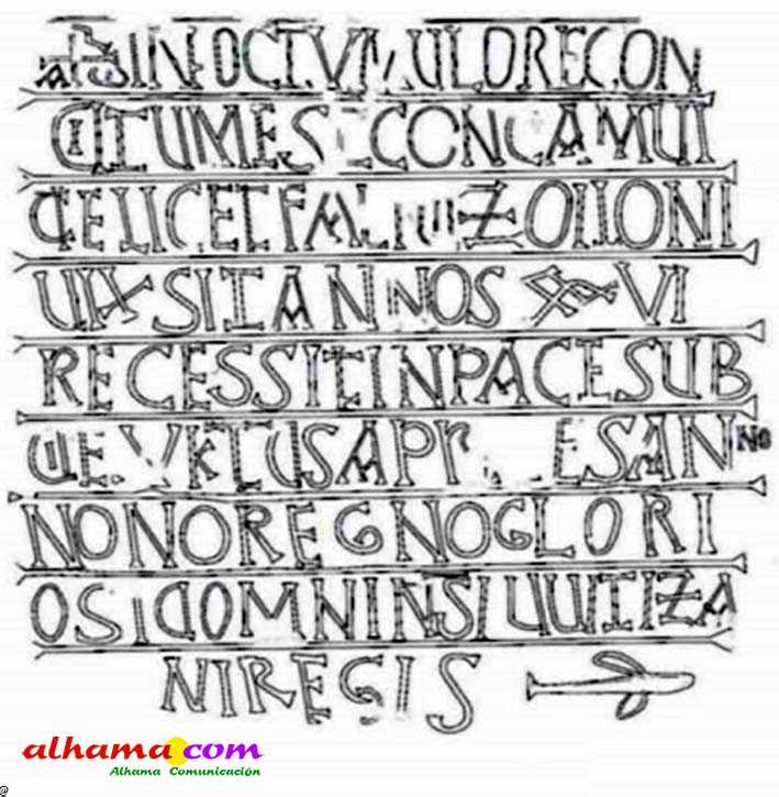((crismón)) En este túmulo está oculto el que en otro tiempo fue Falidius Zoilonius que vivió 76 años. Descansó en paz el 28 de marzo en el año noveno del glorioso reino de nuestro señor el rey Witiza {709} (pez)