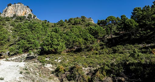 El carril que conduce al cortijo de Marchiche parte desde la Resinera y llega hasta el paraje de La Monticana. Pero no era éste el que existía en tiempos de Antonio. Al cortijo se venía entonces por dos caminos de herradura: uno salía desde Jayena atravesando barrancos y collados, y el otro subía desde el cauce del río Cebollón. Entonces los terrenos que rodeaban el cortijo estaban formados por un bosque continuo de pinos y numerosas hazas donde se sembraban distintos tipos de cultivo. Justo por encima de la casa, precisamente, crecía un grupo de pinos jóvenes -hoy siguen en el mismo sitio, enormes ya y en plena madurez- que ellos llamaban "la lomilla de los pinos reales" porque los árboles pertenecen a esa especie. Toda esa loma, que ascendía suavemente hasta la peña del Cerro del Águila, estaba tapizada por un espeso pinar mezclado con monte bajo que se parecía mucho al que existe en la actualidad.