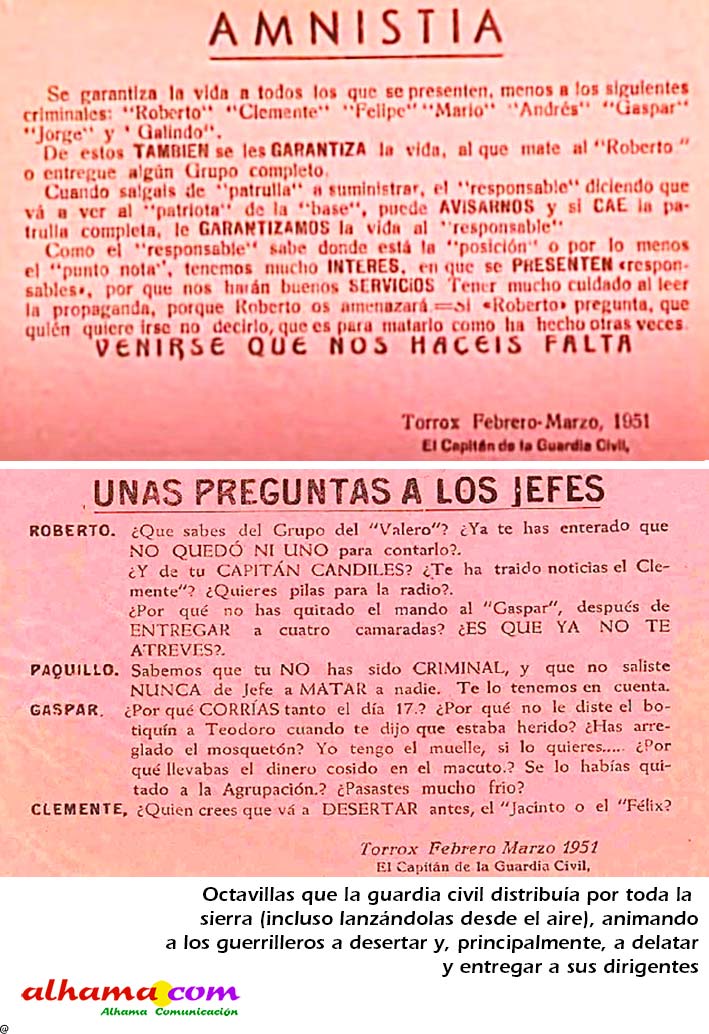 Total, que ya no tuvo más remedio que contarme que la gente de la sierra aquí (por aquí por cerca de Málaga) le había cogido a él para matarlo. Porque resulta que Manolo se había ido y no habían tenido noticias, y que el otro… se habían ido una pila y que conforme se iban, ya no tenían noticias ya nunca más de ellos. Y es que resulta que ya don Ángel Montesdeoca, que era teniente coronel de la guardia civil (que yo llegué a conocerlo), pues claro, lo iba… y Enrique Domenec estaban de acuerdo y ahora, cuando venía uno para irse (porque estaban disponiendo ya para irse para Francia, porque aquí ya se había puesto la cosa mala), pues ellos los iban cogiendo; los iban deteniendo. Entonces claro: se iba uno y no sabían nada, y se iba otro y no sabían nada, y entonces le echaron la culpa a este Ángel de que es que ellos los estaban traicionando. Entonces Ángel les rogó a ellos que por el trabajo, por el tiempo que había estado sirviendo, que le concedieran siquiera de defenderse; que su familia estaba allí, que si él se iba, que podrían coger a su familia. Total, que Ángel vino a mi casa y yo, cuando vi la cosa así, entonces le saqué la carta. Ya le dije:”Mira, esta carta me la dio Roberto y a mí me dijo que no se la diera a nadie nada más que a Manolo”; pero yo no había vuelto a ver a Manolo ni a saber nada de él. Entonces Ángel abrió la carta delante de mí y la leyó. Y lo que decía en la carta pues… era que se dirigía a Manolo, diciendo que como la cosa se había puesto ya tan mal para ellos aquí en la sierra, que metiera ``la criba´´, y que los que valieran la pena que se fueran yendo (para pasarse para Francia), y que los demás que los dejaran ahí. ¡Imagínese Roberto diciendo una cosa así! En resumidas cuentas, pues los que… unos cuantos que había, que eran más inteligentes, como los Frailes y algunos pocos más, y dejar a todos los que ellos se habían llevado ahí; que Roberto les enseñó a los muchachos que la última bala era para uno, porque la carne era débil, y que si los civiles los cogían pues los torturarían. Y hubo precisamente un muchacho de la Acebuchal que se llamaba José, con veintitrés años; no le quedaban tiros y antes de que le cogieran los civiles vivo, se cortó la garganta él mismo. Figúrese usted, y ahora Roberto pues decía eso, que metieran la criba y que los que no valieran que los dejara ahí. Que dieran cuatro saltos. Y esa carta le salvó la vida a este muchacho, a Ángel, que se la llevó y se la entregó a ellos, que entonces fue cuando se quedaron ahí en Frigiliana unos que le llaman “los Rosa”, que ya hicieron allí herejías, que ya esos no tenían nada que ver ni con los Frailes ni con nada, porque esos es que se quedaron ya ahí solos, y ellos ya se mandaban por su cuenta. Que los Rosa mataron ahí a unos cuantos en Frigiliana (entre ellos a un muchacho con veinte años, que le hicieron de todo también a la criatura, y al padre también lo mataron), y eso ya no fue cosa de la gente de la sierra del principio, sino de que ya se quedaron ahí, porque Manolo no llegó a leer esta carta: Manolo ya lo había cogido la guardia civil, por don Ángel… por Enrique Domenec y don Ángel Montesdeoca. Lo habían cogido a Roberto (a Roberto no, a Manolo) y a otros cuantos así, más… a Felipe también, que era el otro hermano, también lo cogieron, y eso; entonces ya se quedaron esos ahí, sin jefe y sin nada, y se hicieron los jefes, a Vicente Rosa (que Vicente Rosa es de Frigiliana; todavía vive) y allí en Frigiliana… pues hizo una sangría. Incluso a su propio hermano lo mató. Porque ya se quedaron esos grupos, como he dicho, sueltos, y el hermano estaba de jefe de un grupo y él también estaba de otro, y entonces se entregó; cuando ellos se vieron así se entregó Vicente, y entonces llegó con la guardia civil donde estaba el hermano con el grupo, y allí tuvieron un tiroteo que murieron unos cuantos, y entre ellos murió el hermano. Su propio hermano murió en aquel tiroteo.