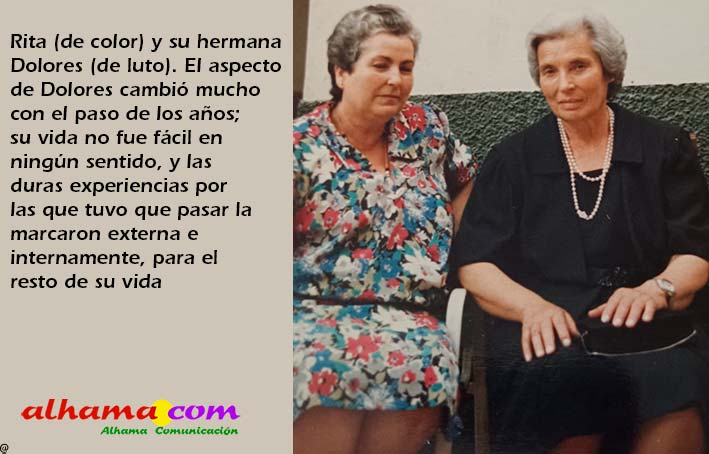 Eso lo supimos después, cuando ya estábamos en Málaga ya supimos, porque mi hermana Dolores se encontró un día en Málaga al Cabo Calé, que como he dicho antes, era el que estaba el día que nos fueron a echar, que iban quince civiles, y ese hombre no fue malo; bueno, el Cabo Calé era fresco como todos (porque allí se presentaba también sin comer y sin nada), sin comida, pero no era como el Cabo Largo, que, que… allí el Cabo Calé no se señaló en nada. Y claro, el Cabo Calé se encontró a mi hermana y ya estuvieron hablando, y ya le dijo que habían quemado ellos la Venta Panaderos; que la habían quemado para que no se metiera dentro la gente de la sierra. Pero es que también mandaron a cortar los olivos, eso fue el Cabo Largo. Y entonces ya le contó eso, dice: “El día que fuisteis vosotros con Agudo a acompañarlo, nosotros estábamos enfrente; mientras que vosotras le salvasteis la vida, él iba al cuartel a contar todo lo que pasaba”. Le contaba todo lo que pasaba al Cabo Largo. Dice:”Por eso ese día que fuisteis nosotros os estábamos viendo desde enfrente, por el Higuerón, una cresta que hay allí que cae enfrente de ese sitio, nosotros os estábamos viendo con los gemelos”. Por eso en cuanto al Cabo Largo se lo llevaron de allí de Frigiliana, detuvieron a Antonio, y a mi padre (creo que lo he dicho antes) que lo detuvieron en Nerja, en Frigiliana nunca. El Cabo este Calé, dice mi hermana que le dio mucha alegría cuando se la encontró, y que le preguntó por mí. “Si viera a Rita me parecería que la estaba viendo por un espejo”.