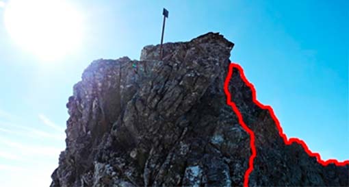 Tras la primera parte del cresteo nos encontramos con una loma en fuerte pendiente, pero que permite un fácil ascenso por un paso lateral; esa subida nos conduce a la segunda parte de la arista, que presenta las mismas características que la primera salvo por un obstáculo, que casi podemos calificar como el punto negro de este trayecto.