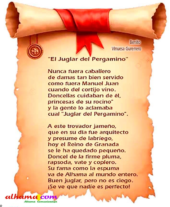 Todos deseamos la pronta recuperación tras su intervención oftalmológica de nuestro compañero de alhama.com y Radio Alhama (i), Manuel García Ruiz, al que como definieron sus hijos con este montaje: "Jameño apasionado con su pueblo, trovador de ESPINELAS en pergamino eterno".
