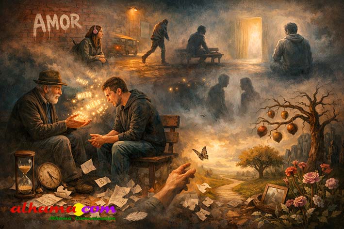III. El hombre que guardaba palabras Había un hombre que no hablaba mucho. Cada vez que algo importante le pasaba, en lugar de decirlo, lo guardaba: Con los años, empezó a sentir un peso extraño en el pecho. Una noche, caminando sin rumbo, encontró a un anciano sentado en un banco. El anciano lo miró y dijo: Al principio no salió nada. Salieron como si hubieran estado esperando años: El hombre empezó a llorar. El hombre se sentó en silencio. Porque hay palabras que no cambian el pasado, Y esa noche, por primera vez, el hombre habló. Reflexión: |
