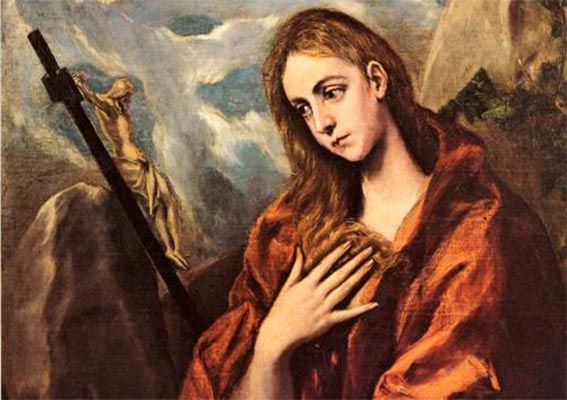 La predilección por la figura de un bello Cristo crucificado y glorificado después de su Resurrección, así como por otros temas nos lleva a percibir ciertos paralelismos entre los escritos de la Santa y determinados secretos místicos del pintor. Una obra cumbre y harto conocida de El Greco, “El Caballero de la mano en el pecho” (1580), muestra a un hombre de mediana edad, ropa elegante, barba y mirada melancólica… Santa Teresa retrata, asimismo, con su pluma a un caballero de su tiempo, cuya descripción bien podía haber sido utilizada como boceto para el retrato del pintor: “Un caballero santo…de vida tan ejemplar y virtuosa y de tanta oración y caridad que en todo él resplandece su bondad y perfección…” Además Santa Teresa comparte con el Greco el entusiasmo por la belleza de las manos, bellas manos espiritualizadas posee “El Caballero de la mano en el pecho”. La Santa ve en sus visiones las manos de Nuestro Señor, y su belleza le arrebata: “Quiso el Señor mostrarme solas las manos con tan grandísima hermosura, que no lo podría yo encarecer”. Texto que evidencia la expresividad psicológica de un retrato espiritualizado y, muy especialmente, de unas manos espiritualizadas.
