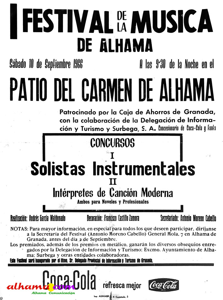 ALHAMA.- No ha sido necesaria la brisa del Mediterráneo, ni un nombre tradicionalmente consagrado a la música, lo que ha dado origen a este nuevo Festival. Han sido unos Tajos quienes lo han inspirado. Alhama de Granada ha dado a la luz un nuevo Festival de la Música en sus dos modalidades: solistas instrumentales e intérpretes de la canción. Lo más importante de este hecho ha sido la entrega incondicional de Andrés García Maldonado, quien solo ha dado vida al Festival, con el empuje que le nace de su ferviente amor a su pueblo. Merece toda clase de elogios.