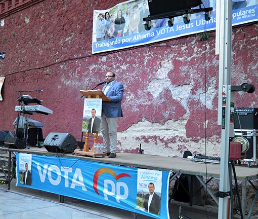 A continuación, sería Ángel Muñoz, quien basó parte de su intervención en hacer un recorrido de como en su gestión potenciando las fiestas se ha gastado la mitad en ellas, y de como se ha sacado a Alhama del agujero negro en la que la sumió el último gobierno socialista, siendo concejal de Hacienda el que ahora se presenta para alcalde, por lo que no es su mejor aval. Se ha creado trabajo, hemos inventado eventos y fiestas con la mitad de lo que se gastaba, arreglamos caminos, adquirimos edificios, fincas, maquinaria… etc., por lo que no vale criticar por criticar. Hay otras opciones políticas que, teniendo un negro curriculum, vienen a darle lecciones a los demás. La cercanía, la humildad, el compromiso y el trabajo son la bandera de esta candidatura y de este alcalde, la cara amable, la responsabilidad de los recursos públicos como si de los propios se tratase…. Las batallas con la Junta de Andalucía han sido épicas, nos tenían cogidos de pies y manos porque creyendo que perjudicaban al PP lo que hacían era perjudicar a todo un pueblo, las películas de la carretera, la depuradora, las denuncias, esto ya se acabó, ahora la Junta nos mira con lealtad institucional. Hoy al fin vamos de la mano con la Junta de Andalucía. Hubo una primera legislatura del PP en la supimos parar una hemorragia económica, ha habido una segunda donde se han equilibrado las cuentas y seguimos pagando deuda socialista, y sin embargo hemos conseguido hitos (enumerando todas las adquisiciones que ha realizado la actual corporación), ahora toca una tercera legislatura en la que, además de seguir pagando deuda socialista, hay que desarrollar todos esos grandes proyectos que transformarán a Alhama, por eso os pido este domingo el voto para Jesús Ubiña.