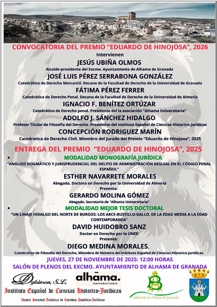 El acto contará con la presencia de Ignacio Francisco Benítez Ortuzar, catedrático de Derecho Penal, presidente de la asociación "Alhama Universitaria", Gerardo Molina Gómez, abogado y secretario de "Alhama Universitaria", José Luis Pérez Serrabona González, catedrático de Derecho Mercantil y Decano de la Facultad de Derecho de la Universidad de Granada, Fátima Pérez Ferrer, Catedrática de Derecho Penal y Decana de la Facultad de Derecho de la Universidad de Almería, Adolfo J. Sánchez Hidalgo: Profesor Titular de Filosofía del Derecho. Presidente del Instituto Español de Ciencias Histórico-Jurídicas, Diego Medina Morales, Catedrático de Filosofía del Derecho, Miembro de Número del Instituto Español de Ciencias Histórico-Jurídicas y Concepción Rodríguez Marín: Catedrática de Derecho Civil. Miembro del Jurado del Premio "Eduardo de Hinojosa" 2025.