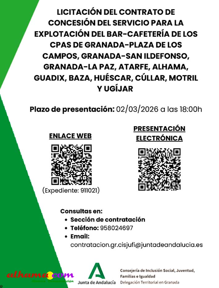 Desde que, con la pandemia, se dejara inexplicablemente abandonados a los mayores de Alhama, y no se prestara el tradicional servicio de comedor, y poco después el cese definitivo del concesionario, y sin voluntad de darle una solución en estos años, ahora la Junta de Andalucía va a adjudicar la gestión del bar‑cafetería del Centro de Participación Activa (CPA) de Alhama de Granada, y busca a una persona autónoma o empresa de hostelería que quiera llevarlo durante varios años. Este bar da servicio principalmente a las personas mayores socias del centro, con un ambiente tranquilo y una clientela fija.