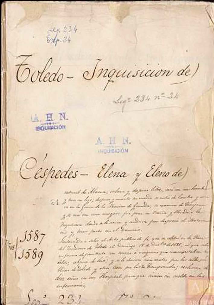 Así es como aparece resumido el caso de Elena o Eleno de Céspedes en el primer folio del expediente correspondiente al proceso de Auto de Fe de la Inquisición llevado a cabo contra ella por el Tribunal de Toledo entre los años 1587 y 1589.